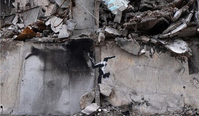 Už o víkendu se Banksy přihlásil k nástěnné malbě ukrajinské gymnastky na budově poničené ruským ostřelováním během války proti Ukrajině. Snímek graffiti v městečku Boroďanka, které leží asi 50 kilometrů severozápadně od Kyjeva, zveřejnil autor na svém účtu na instagramu. Gymnastka dělá stojku uprostřed trosek, napsala britská stanice BBC na svém webu.