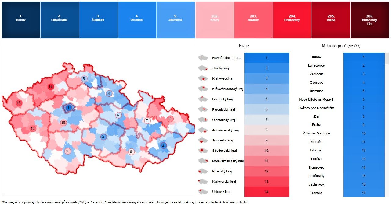 Nejhůře v hodnocení dopadly Ústecký, Karlovarský a Plzeňský kraj. „V praxi může být pozice mikroregionu v žebříčku dána do jisté míry faktory, jako je třeba historie nebo geografie, které se nachází mimo vůli jejich obyvatel a samosprávné reprezentace,“ podotýká ekonom ČS Michal Skořepa.