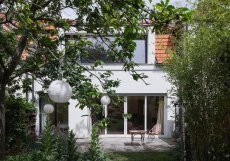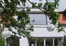 Zvenčí dům zásadní proměnu vnitřních prostor příliš neprozrazuje. Barevně tlumená fasáda, kombinující jemnozrnnou a hrubou omítku se vstřikovaným kamenným zrnem, zklidnila celkový výraz stavby. Historizující členění oken nahradilo soudobé řešení, které výrazně prosvětlilo interiér. Okna různého konstrukčního i materiálového provedení – dubová, bezrámová nebo s bělenými smrkovými rámy – reagují na charakter jednotlivých místností. Rozdílný rozsah původních a nových oken naznačuje jejich materiálové řešení. Nejvýraznějším zásahem do exteriéru jsou dispoziční úpravy patra, kde původní dva malé vikýře nahradil jeden velkorysý, bezrámově prosklený směrem do zahrady.