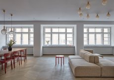 Střídmost a estetická čistota je patrná už ve vstupním prostoru. Dispozice bytu je rozčleněna do tří funkčních celků. Obytný prostor přímo propojený se vstupní halou představuje společenskou zónu s velkými okny do ulice.
