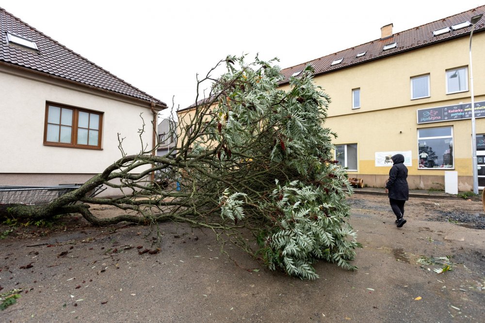 Situaci po vydatných deštích komplikuje silný vítr, na silnici je padlý strom, 15. září 2024, Třebíč.
