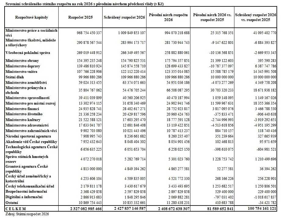 Srovnání návrhu státního rozpočtu na rok 2026 z dílny minulé vlády premiéra Petra Fialy a rozpočtu připraveného kabinetem Andreje Babiše, který po pátečním podpisu prezidenta Petra Pavla putuje do sbírky zákonů, ukazuje rozdíly v prioritách obou vlád.