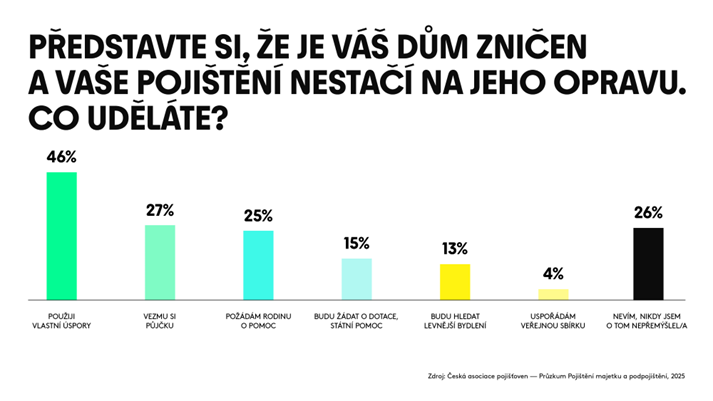 Nedávný průzkum České asociace pojišťoven ukázal, že by Čechům na nový dům chyběly statisíce. Pro 17 procent z těch, kteří mají alespoň částečnou představu o hodnotě domu a výši pojistky, by ztráta přesáhla milion korun. Řešení by přitom byla rozmanitá a nechybí v nich ani žádost o pomoc veřejnosti. „Pokud by Čechům kvůli podpojištění chyběly finance na obnovu domova, sáhly by v první řadě do svých úspor,“ upřesňuje gestorka neživotního pojištění České asociace pojišťoven Lenka Slabejová. Touto cestou by se podle průzkumu vydalo 46 procent respondentů. Další možností je pro Čechy půjčka (27 procent) nebo pomoc rodiny (25 procent).