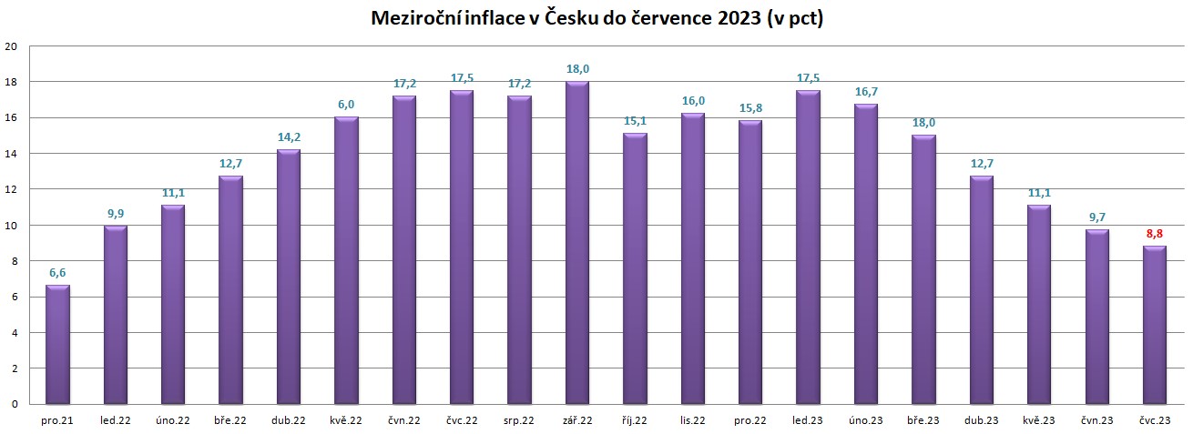 Meziročně vzrostly spotřebitelské ceny v Česku v červenci o 8,8 procenta, což bylo o 0,9 procentního bodu méně než v červnu. Meziměsíčně stouply o 0,5 procenta. Tento vývoj byl ovlivněn zejména vyššími cenami v oddíle rekreace a kultura. Data zveřejnil Český statistický úřad (ČSÚ).