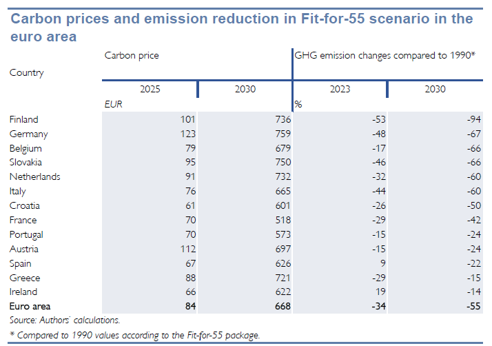 Autoři se zaměřují pouze na země eurozóny, ale za celou EU nutně platí velmi podobná cifra, protože ekonomika eurozóny letos představuje zhruba 84 procent ekonomiky EU. I mezi zeměmi eurozóny však panují značné modelové rozdíly. Například na Slovensku by měla dle uvedené studie cena emisí vyjít roku 2030 na 750 eur za vypuštěnou tunu oxidu uhličitého nebo ekvivalentu, a v Německu dokonce na 759 eur (viz tabulka níže), pokud by ceny emisí, respektive povolenky měly kompletně zajišťovat redukci emisí v eurozóně tak, aby byl splněn program Fit for 55, tedy aby emise skleníkových plynů klesly do roku 2030 o 55 procent v porovnání s rokem 1990.