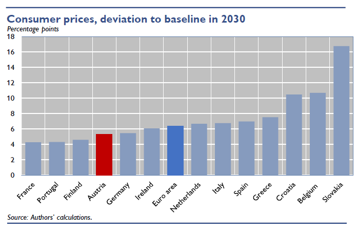 Protože je Slovensko méně ekonomicky rozvinutou ekonomikou než Německo, byly by v rámci eurozóny zvláště tam makroekonomické důsledky tíživé, plyne dále ze studie rakouské centrální banky. A to i když, samozřejmě, bude pro celou eurozónu, resp. celou EU platit jedna cena emisí, resp. emisní povolenky. Která má být roku 2030 modelově oněch 668 eur, nikoli 750.