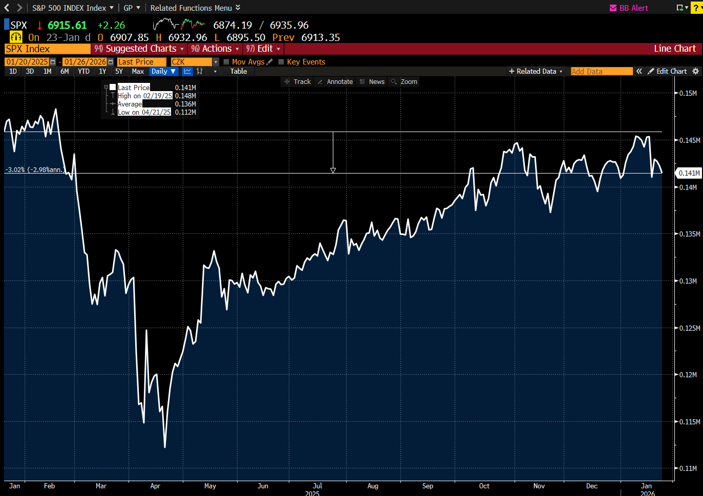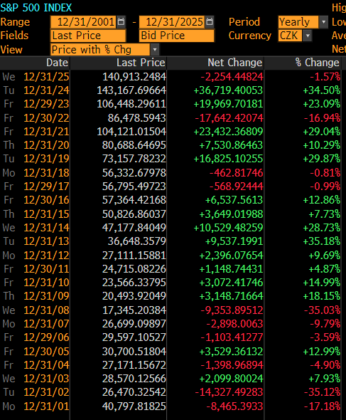 Loni Standard & Poor's 500 v korunách ztratil 1,6 procenta, po růstu roku 2024 o 34,5 procenta (viz tabulka níže).