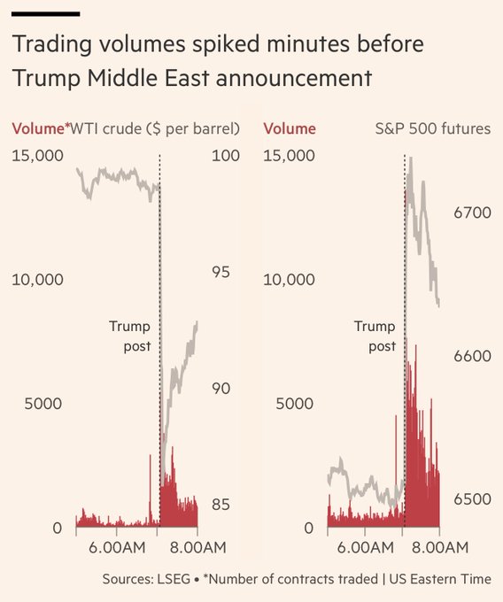 V jistém smyslu obdobnou akci, „verbální intervenci za zpevnění akcií“, nyní evidentně provádí Trumpův tým. Přičemž podle některých „zlých jazyků“ na tom navíc ještě dobře vydělává, a to obchodováním za využití neveřejné informace. Například list Financial Times upozorňuje na zvláštní vzestup intenzity obchodování, k němuž toto pondělí došlo zhruba 15 minut předtím, než Trump zčistajasna světu oznámil, že o víkendu probíhala mezi Washingtonem a Teheránem konstruktivní jednání a že proto odkládá úder na íránské elektrárny (viz graf níže). Někdo ideálním načasováním rozsáhlého obchodu, prodejem ropy a nákupem amerických akcií, vydělal „balík“, když za čtvrt hodiny, po Trumpově oznámení, vskutku cena ropy spadla, zatímco akcie poskočily výše.