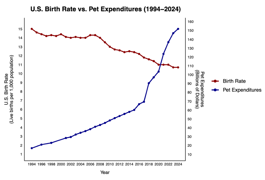 S povážlivě klesající porodností se i v Česku rozšiřuje fenomén bezdětných domácností, které si dítě nahrazují nejčastěji psem či kočkou. Podobná situace panuje i v ekonomicky nejvyspělejších zemích světa, včetně USA. Tým psychologů z amerických univerzit ve své letošní studii na dané téma dospívá k závěru, že „obzvláště bezdětní pejskaři mají sklon vnímat svého psa jako spřízněnou duši, přičemž data odhalují, že klesající porodnost je silně spjata s růstem výdajů za mazlíčky“ (viz graf níže: červená křivka zachycuje klesající porodnost, modrá pak stoupající výdaje za mazlíčky, jejichž vzestup ke markantní o po očištění o inflaci a růst ekonomiky).