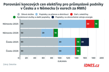 Přitom, jak vidno z grafu výše, české převedení poplatku za obnovitelné zdroje je jen pětinové v porovnání s tím, jakou úlevu chystají průmyslu roku 2026 právě Němci. A nejen průmyslu. Uleví také domácnostem, třeba v podobě dotování poplatků za přenosovou soustavu. Jen tato úleva, která je plošná, bude v Německu v přepočtu na obyvatele o 17 procent vyšší než české dotování poplatku za obnovitelné zdroje.