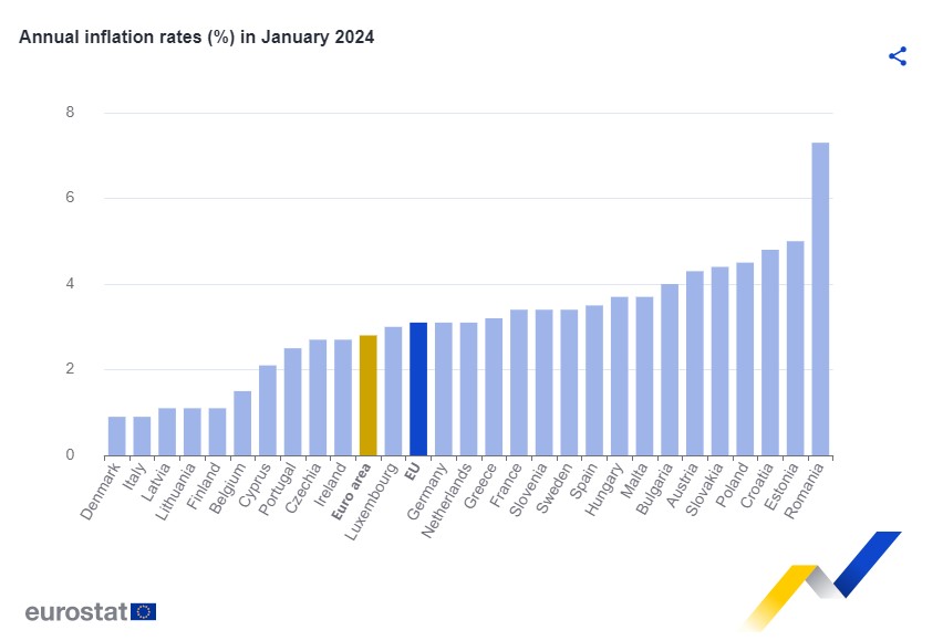 Inflace v Česku prudce klesá. Podle dnešních čísel Eurostatu ji Česko mělo letos v lednu devátou nejnižší v EU (viz graf níže). Byla podprůměrná jak v rámci EU, tak i eurozóny. Česko navíc vykazovalo citelně nižší inflaci než všechny další země Visegrádské čtyřky. Co více, tuzemská inflace by letos měla zůstat na poměry EU podprůměrná celoročně.