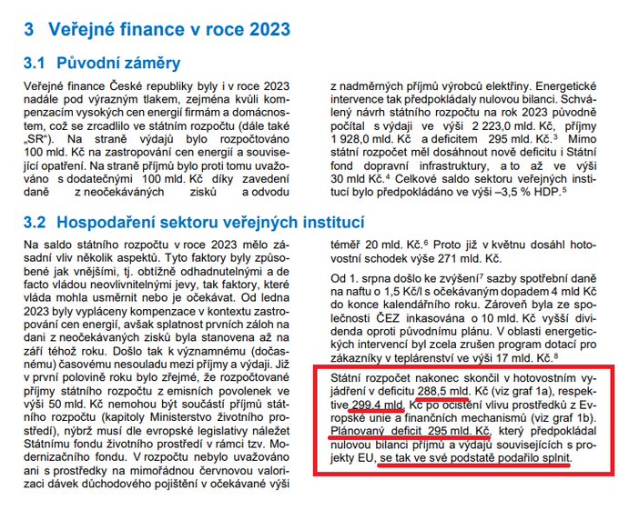 Poslední citovaná věta je zásadní. Rada totiž konstatuje splnění plánovaného deficitu, které ale striktně vzato platí za daný rok pouze při uplatnění vyčíslení schodku se zahrnutím pozice vůči EU a finančním mechanismům. Při tomto zahrnutí, v neočištěné podobě, totiž za rok 2023 vzniká schodek 288,5 miliardy korun, který je tedy nižší než údaj 295 miliard korun. Zatímco v očištěné podobě vzniká deficit 299,4 miliardy korun, který je vyšší než údaj 295 miliard korun, takže schodek splněn není.