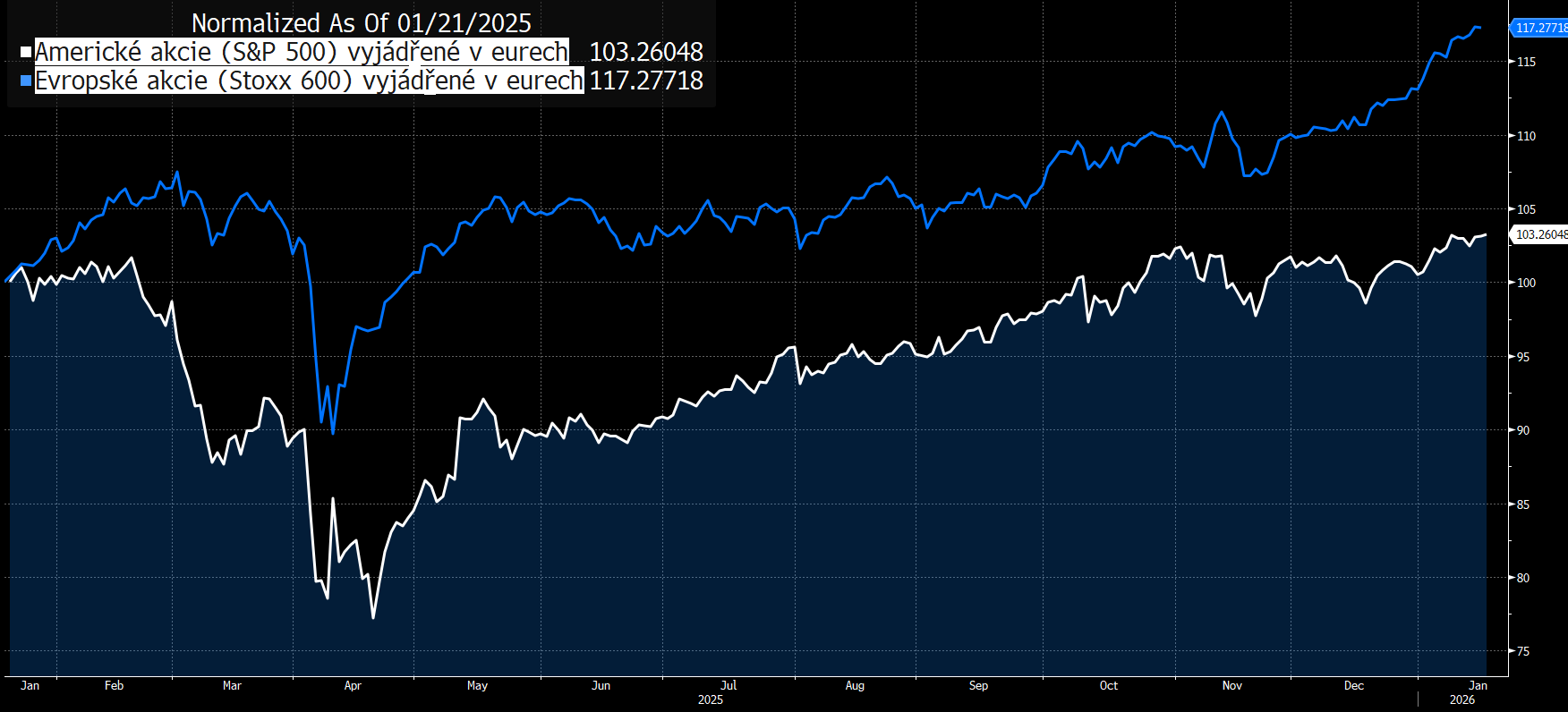 Ani v tomto týdnu nelze čekat, že by pod vlivem nových Trumpových cel, „grónských“, na osm evropských zemí, členských států NATO, akcie v Evropě výrazněji oslabily. Nůžky mezi evropskými a americkými akciemi se navíc od konce loňska ještě rozevřely, jak vidno z grafu výše, takže evropské akcie mají vytvořený dostatečný polštář pro případný pokles, který by však, pokud vůbec nastane, měl být jen přechodný.