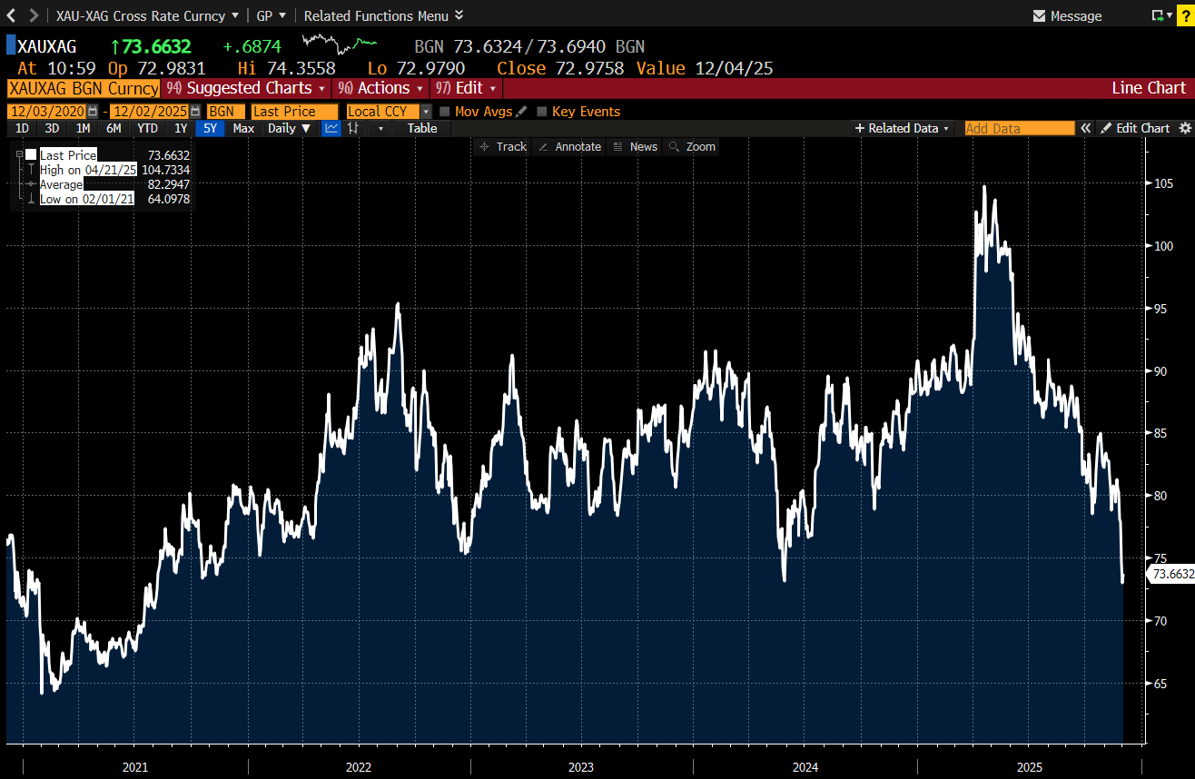 O extrémní ceně stříbra svědčí i to, že je nyní nejdražší ve vyjádření ve zlatě za celé období od začátku srpna 2021, a to přitom letos zlato rovněž překonává historický rekord za rekordem. Při včerejším uzavření burz bylo možné za unci zlata pořídit jen necelých 73 uncí stříbra. To je nejméně od 6. srpna 2021, vyplývá z dat agentury Bloomberg (viz graf níže).