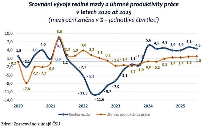 Pohled na srovnání reálných mezd a úhrnné produktivity práce (viz graf níže) odhaluje nebezpečný trend. Po inflačním šoku reálné mzdy v roce 2024 a 2025 výrazně oživily a rostou tempem kolem čtyř až pěti procent meziročně. Jenže produktivita práce? Ta roste výrazně pomaleji, většinou jen kolem jednoho až maximálně dvou procent.