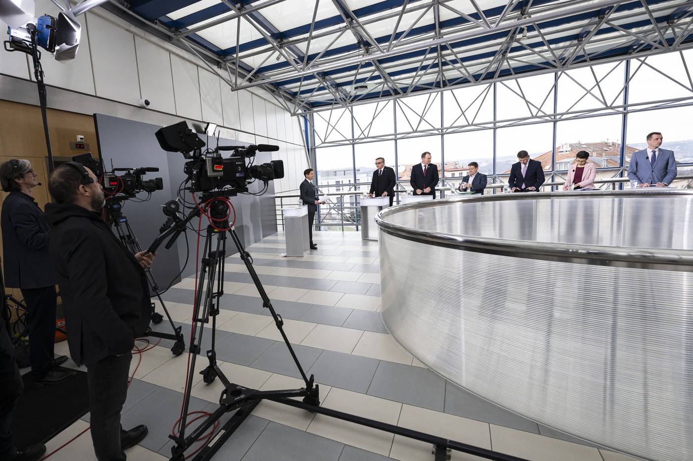 Debata ČT. Moderátor Lukáš Dolanský a jeho hosté Jiří Barták (Motoristés), Radim Fiala (SPD), Patrik Nacher (ANO), Jan Skopeček (ODS), Olga Richterová (Práti) a Lukáš Vlček (STAN). ČTK