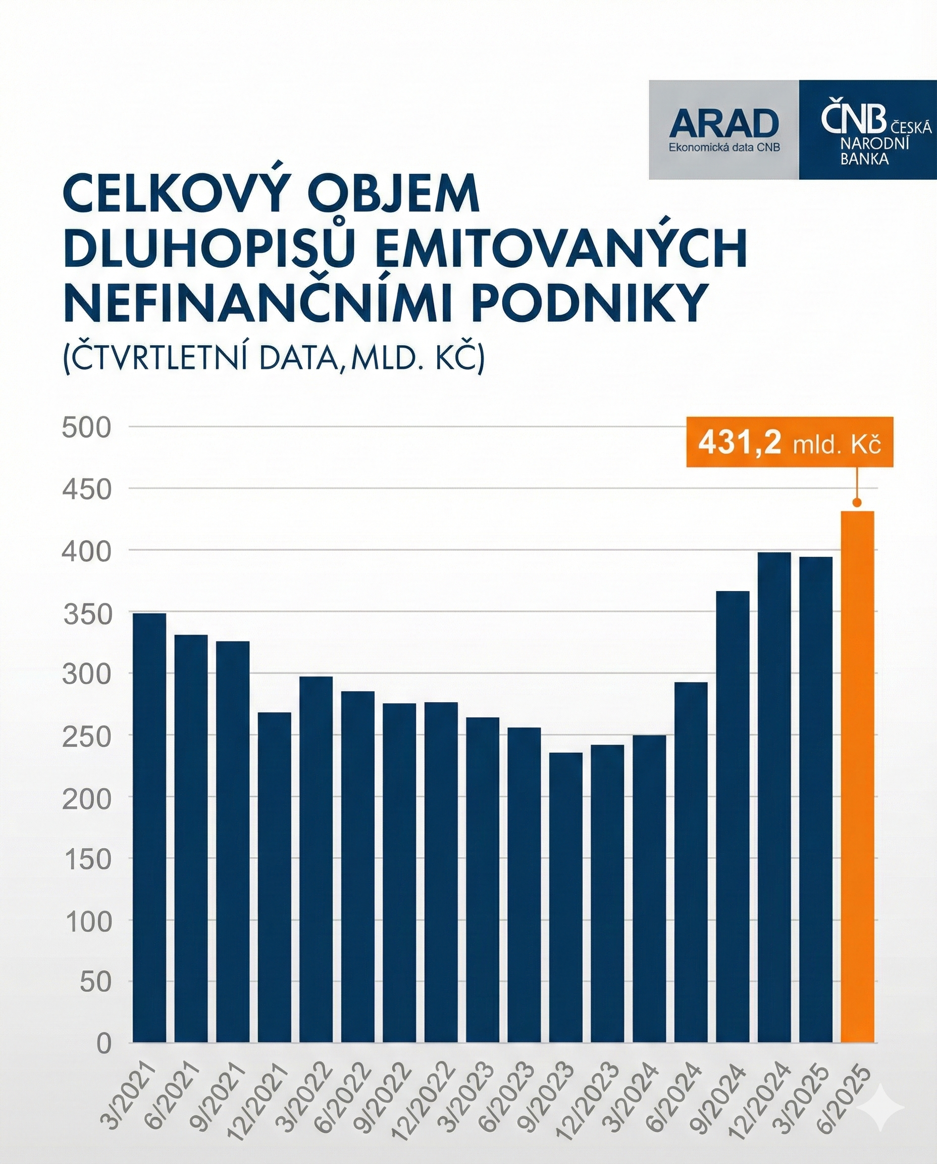 Nový projekt přichází v době, kdy český trh firemních dluhopisů roste rekordním tempem. Podle dat České národní banky (viz graf) dosáhla hodnota dluhopisů vydaných domácími nefinančními podniky na konci druhého čtvrtletí letošního roku 431,2 miliardy korun, což je nejvyšší údaj v historii. Firmy podle analytiků čím dál více využívají dluhopisy jako flexibilní zdroj financování v době vyšších úrokových sazeb, zatímco investoři hledají předvídatelné a pevně úročené produkty.
