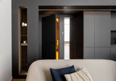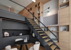 Dominantou bytu je vestavba přes celou výšku prostoru se skleněným schodištěm a obytnou stěnou. Ta propojuje úložné prostory, knihovnu i místo pro odpočinek. V přízemí je obývací část s kuchyní v matném antracitu, která navazuje na předzahrádku a rozšiřuje obytný prostor zejména v teplejších měsících.