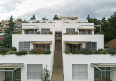 Výsledkem je terasový dvojdům, který má dvě tváře. Do ulice působí nenápadně, jako jednopodlažní stavba se šikmou střechou, respektující měřítko sousedních rodinných domů. Směrem do svahu se ale dům postupně rozrůstá, ustupuje terénu a otevírá se k jihu. Tím se přirozeně hlásí k terasovým bytovým domům, které se nacházejí nad ním.
