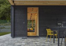 Exteriér je obložen černými horizontálně kladenými prkny, která podtrhují liniový charakter krajiny a vytvářejí silný kontrast ke světlému interiéru. „Materiálové řešení je záměrně střídmé. V exteriéru dominuje černě mořené dřevo, které nechává vyniknout světle laděný interiér. Díky tomu je atmosféra domu klidná a přirozená,“ popisuje studio.
