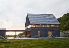 Dům u Kolína zaujme na první pohled: černá „stodola“ s panoramatickým oknem nabízí moderní a úsporné bydlení přímo v krajině.