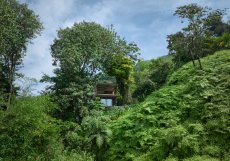 Dům stojí mezi vzrostlými stromy, jejichž kořeny se staly nedílnou součástí projektu. Terén svažující se dvěma směry určil tvar i dispozici stavby. Jedna z fasád záměrně chybí, obytný prostor se zcela otevírá okolní džungli, světlu i proudícímu vzduchu.