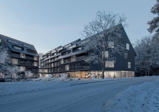 Betonový sokl, dřevo a sedlová střecha, tak lze popsat třeba tradiční krkonošskou roubenku, ale i moderní apartmánový hotel. Jeden takový, podle projektu architektů ze studia Perspektiv, brzy vyroste v Harrachově.