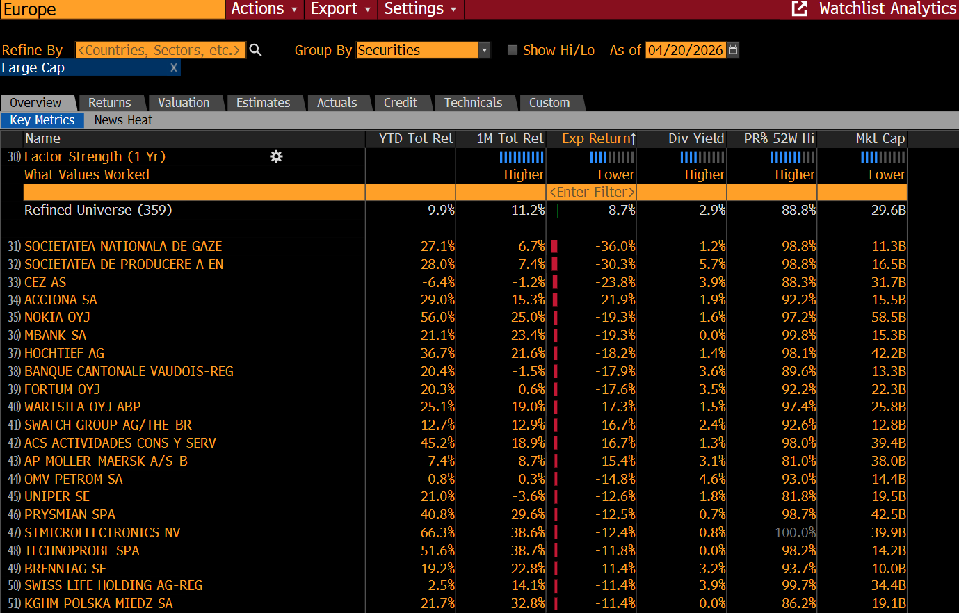 Dále, podle konsensu analytiků je nyní ČEZ třetí nejvíce nadhodnocenou ze 410 největších burzovně obchodovaných firem Evropy. Analytici i po lednovém propadu v konsensu očekávají ve zhruba ročním horizontu pokles akcií ČEZ o dalších zhruba 24 procent. Více nadhodnocené jsou ze 410 velkých evropských firem (kategorie „mega cap“ a „large cap“), s jejichž akciemi se burzovně obchoduje, už jen dvě rumunské většinově státní energetické podniky (viz tabulka níže).