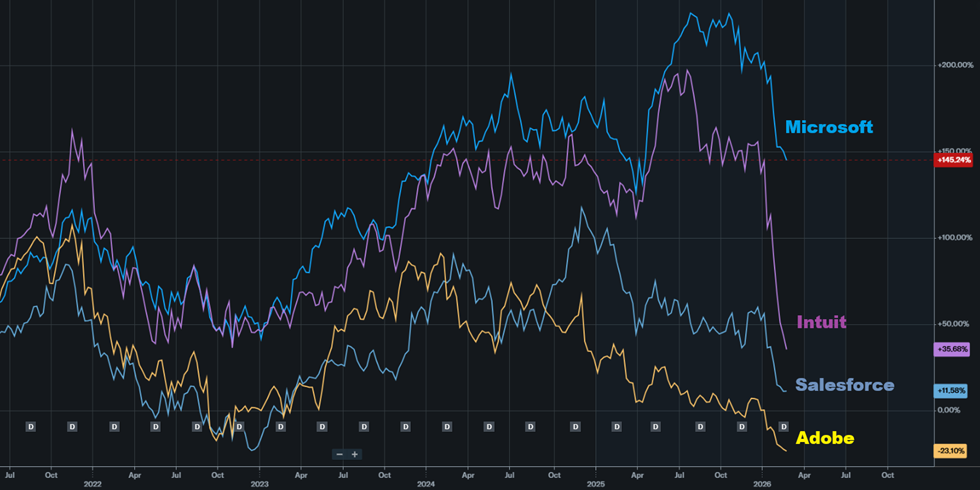 V posledních měsících (a u některých titulů už déle) jsme svědky ostrých výprodejů akcií zavedených softwarových firem. Typickým příkladem jsou Microsoft, Intuit, Adobe nebo Salesforce. Zatímco obecné americké akciové indexy nevykazují velké poklesy, akcie těchto ikonických softwarových společností spadly ze svých vrcholů o 30 až 60 procent. Důvod? Obava, že rozvíjející se umělá inteligence (AI) z jejich v současnosti placených služeb udělá komoditu neboli něco, co bude levné nebo rovnou zdarma.