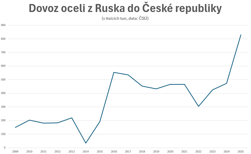 Česká republika loni prudce navýšila dovoz oceli z Ruska, na suverénní historický rekord. Dovezla takřka 830 tisíc tun této suroviny, meziročně o bezmála 76 procent více, vyplývá z dat ČSÚ. Hodnota tohoto dovozu dosáhla takřka 10 miliard korun. Česko tak nadále pomáhá financovat ruské válčení na Ukrajině, přestože od přímého odběru ruské ropy a zemního plynu se již odstřihlo.