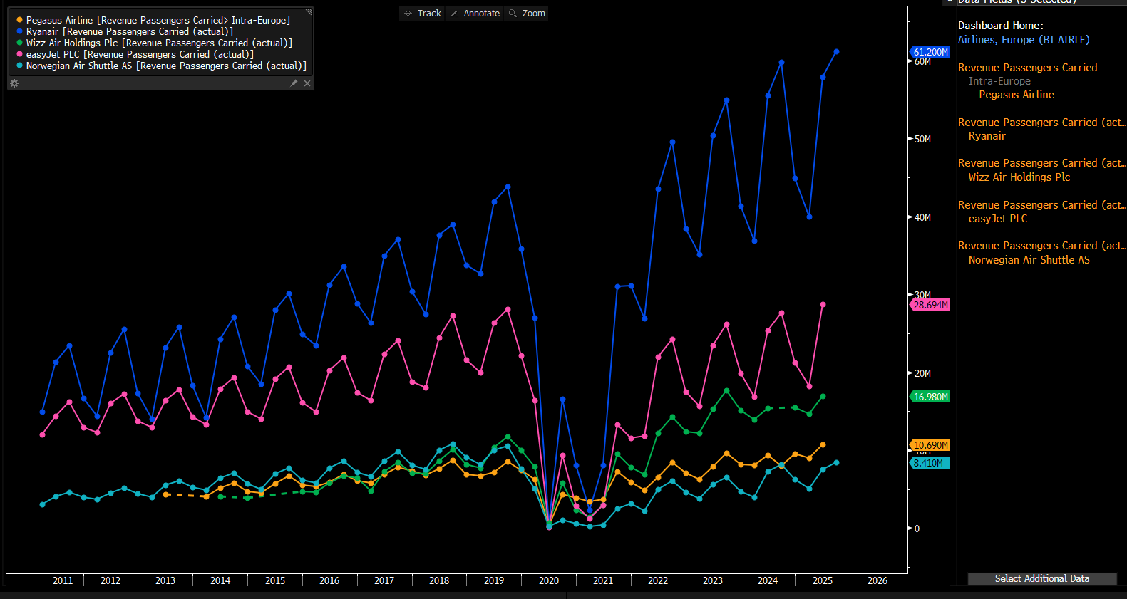 Ryanairu by měla v příštím roce též prospět realizace opožděné dodávky strojů Boeing 737 Max 8 a v letech 2027 či 2028 také začlenění letadel Max 10 do jeho flotily. WizzAir sice omezuje svoji expanzi, avšak v Evropě může růst i nadále, kvůli přesunutí dopravních kapacit zpět z Blízkého východu. Rovněž EasyJet se zotavil z pandemického propadu, předloni srovnal dopravní kapacitu s úrovní roku 2019 a nyní vykazuje meziroční míru růstu v rozsahu jednotek procent.
